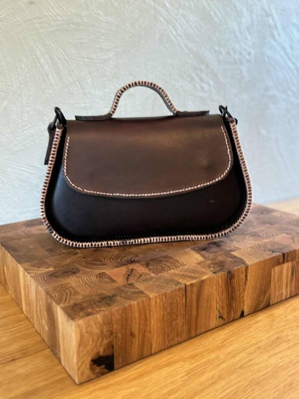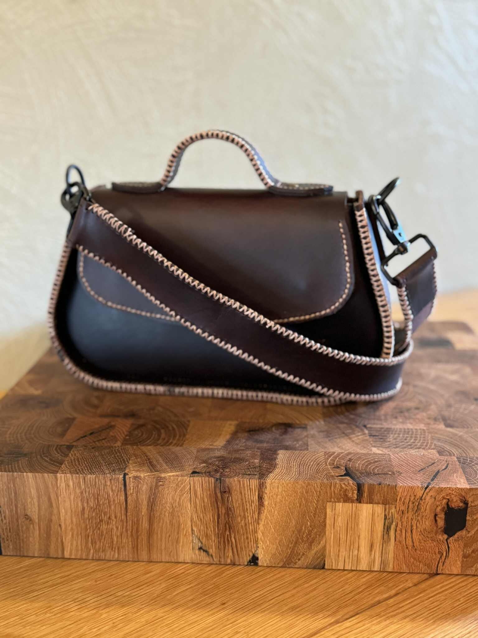 En veske som kombinerer tradisjonelt håndverk med tidløst design. Laget i tykt, ekte skinn med kraftige kontrastsømmer, gir den et uttrykk som både er elegant og røft.